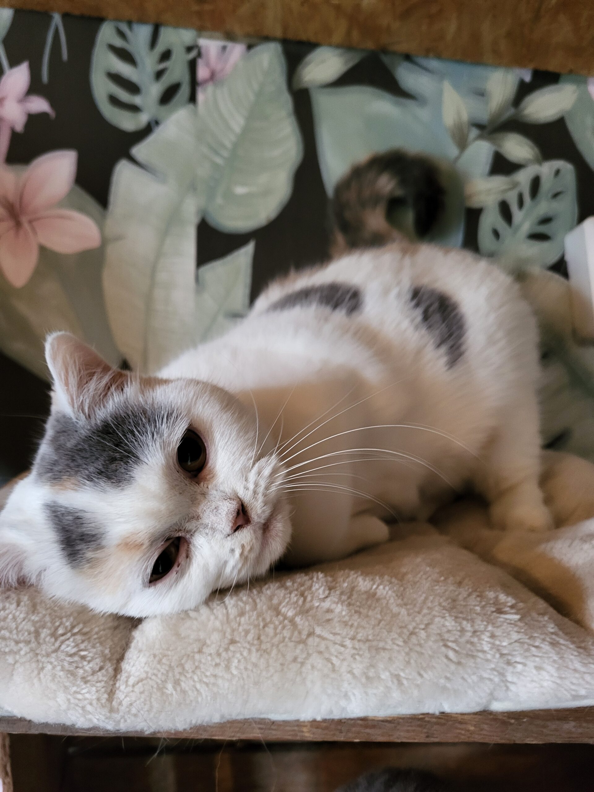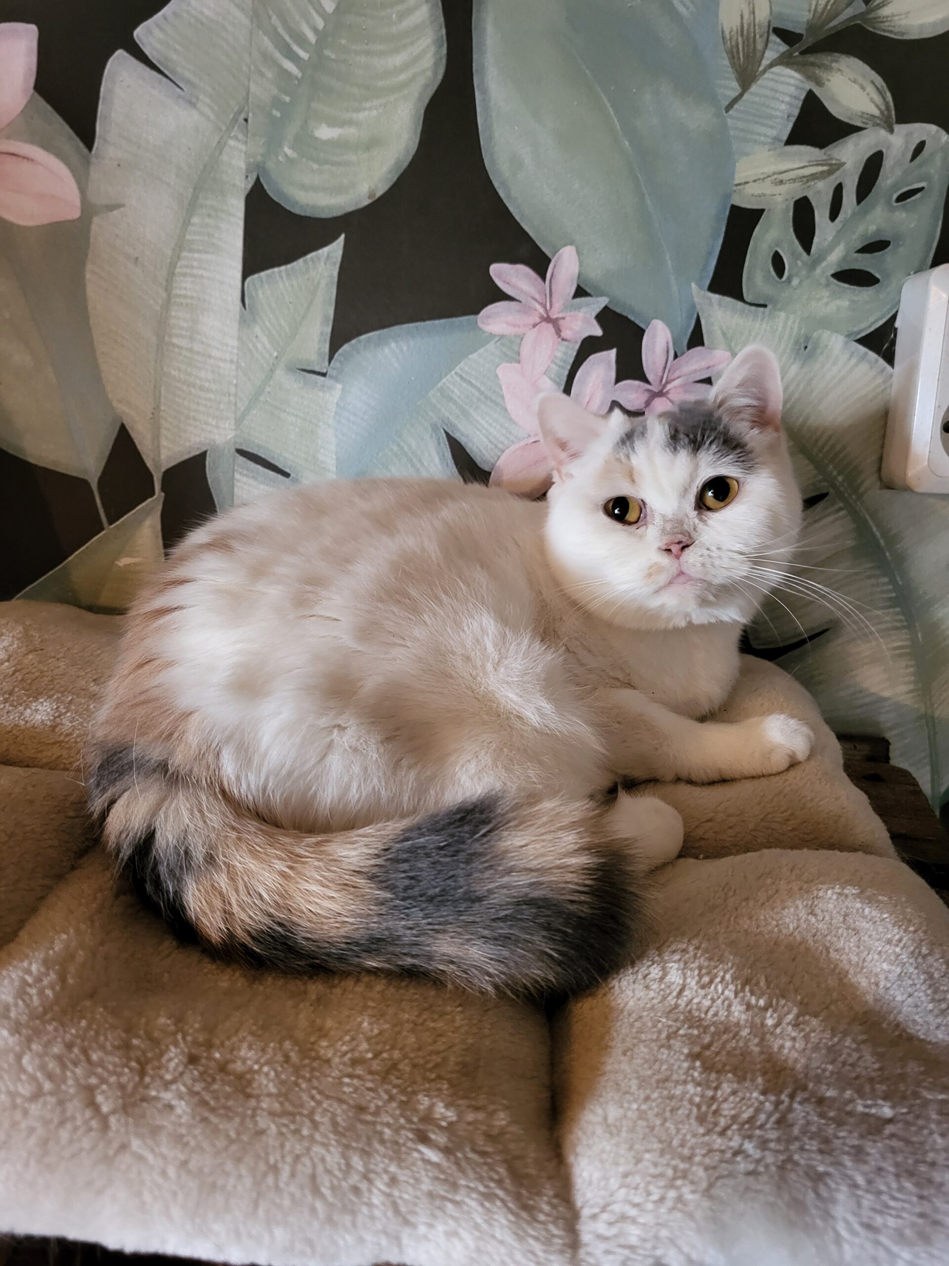 Ze is een fijne poes, heeft heel zachte karakter. Ze kwam bij ons wonen toen ze 1,5 was. Was ze bij begin beetje bang, maar inmiddels goed gewend en kan heel goed met onze andere katten. Ze is super aanhankelijk poes